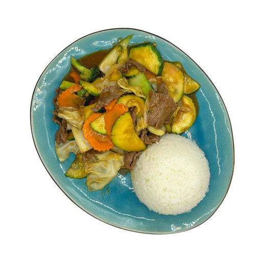 Gebratener Rindfleisch mit Hoisinsauce (Scharf), mit Gemüse und Reis serviert