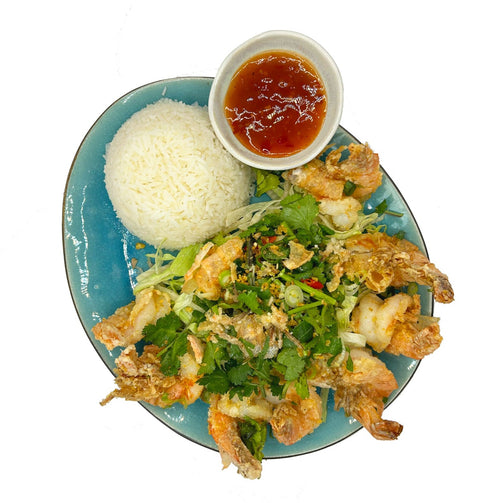 knusprige Garnelen mit Knoblauch, Chili, Koriander, Salat und Reis (B)