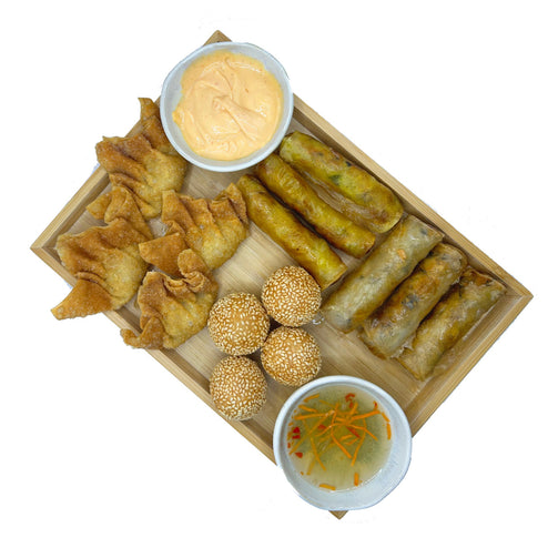 3 Stk Frühlingsrollen (Garnelen & Schweinefaschiertes), 3 Stk Frühlingsrollen Vegan (Tofu und Bohnen), 4 Stk Knusprige Wan Tan (Garnelen & Huhn), 4 Stk Sesamkugel (gesalzenem Eigelb)